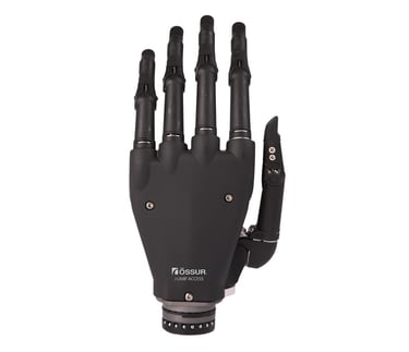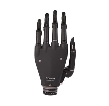 Uma mão protética mioelétrica e multiarticulada que oferece cinco dígitos acionados individualmente e polegar giratório manualmente.